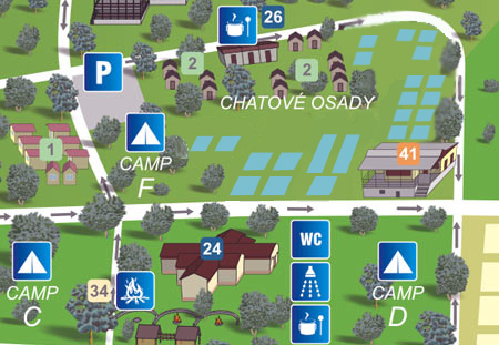 V chatové osadě jsou rozmístěna venkovní veřejná ohniště s posezením. WC, sprchy jsou v areálu kempu společné, vzdálené cca 100 m, za poplatek 20,-Kč/7 min. K dispozici celých 24 hodin jsou samoobslužné automaty s občerstvením - bagety, limonády, cukrovinky, káva, čaj, čokoláda…